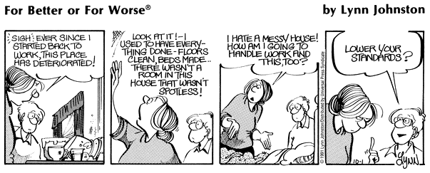 Lynn's Comments: The comment "What you need is a wife," never used to bother me. I didn't think of it as sexist. For the most part, we are more organized; we like to keep things clean and tidy. Today, however, I'm more likely to take the side of the independent woman and say, "What you need is discipline, pride, and self control!" After his marriage, by the way, my brother became extremely tidy!