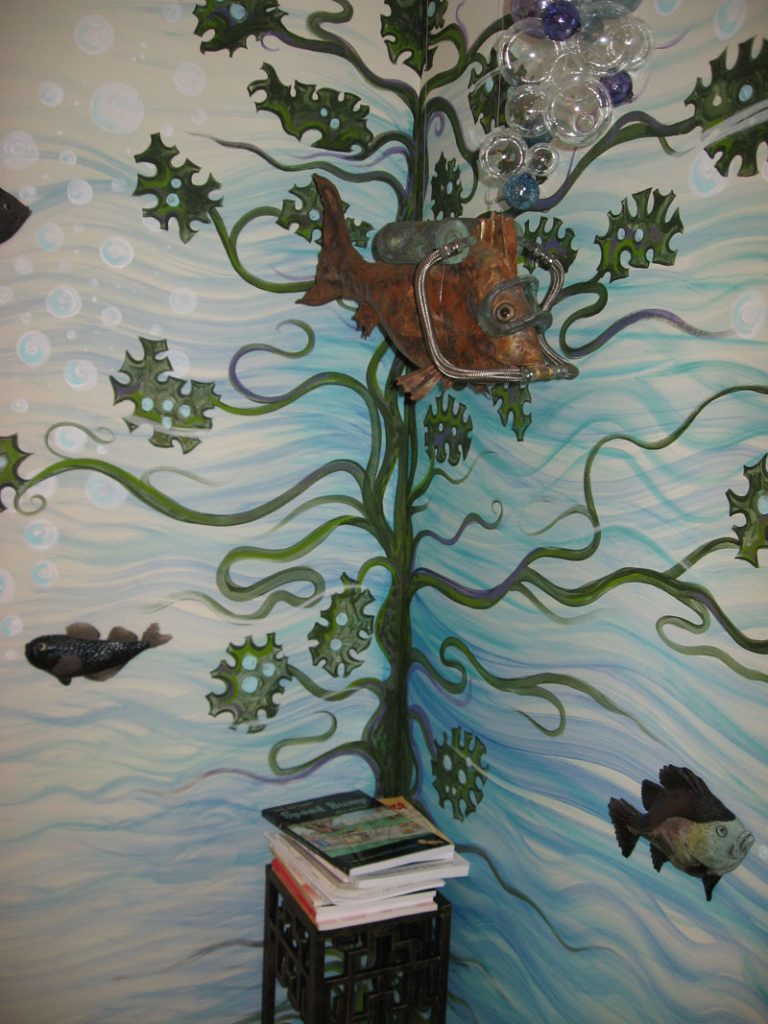 This goofy fish was hanging in a shop in Sarasota, Florida. We were there visiting Cathy Guisewite and her family, and I had to bring this big, bulky piece of art home. I knew exactly where it was going to go. The bathroom in the house where I had set up my third studio had a communal bathroom, which had no windows and was a long, odd shape. I painted an undersea scene on the end wall, bought some pottery fish to hang on the lower part of the “mural,” and my Sarasota sea guy was hung from the ceiling. I had my glassblower-friend make some bubbles, which put the final touches on what was a funny and much admired bathroom enhancement. When we moved west, I brought the metal sculpture with me. It’s in storage now waiting to find a new bathroom home in what will be my 5th studio!