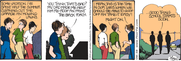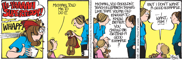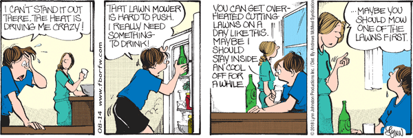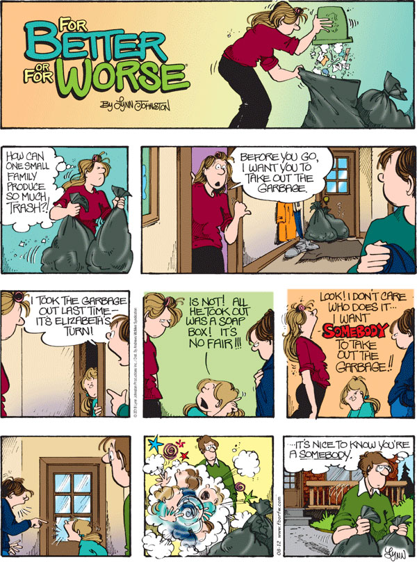 Lynn's Comments: I know the kids today are wearing a lot more than shorts and a helmet when learning to ride a skateboard. We've tried many times to bring the strip up to date by adding seat belts and helmets, and removing sexist remarks and cigarettes. I thought about adding kneepads to Elizabeth’s gear here, but then there would be no gag.