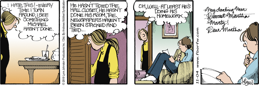 Lynn's Comments: I once received a very nasty, angry letter from a woman who was objecting to a strip I had done. I looked up the strip and was surprised by her reaction. It was a very benign gag…nothing worthy of such a tirade. I wondered if she’d had a bad day and decided to take out her frustration on me! I replied to her letter, asked about this, and I also asked if she was feeling better now. Her reply in return was great fun.