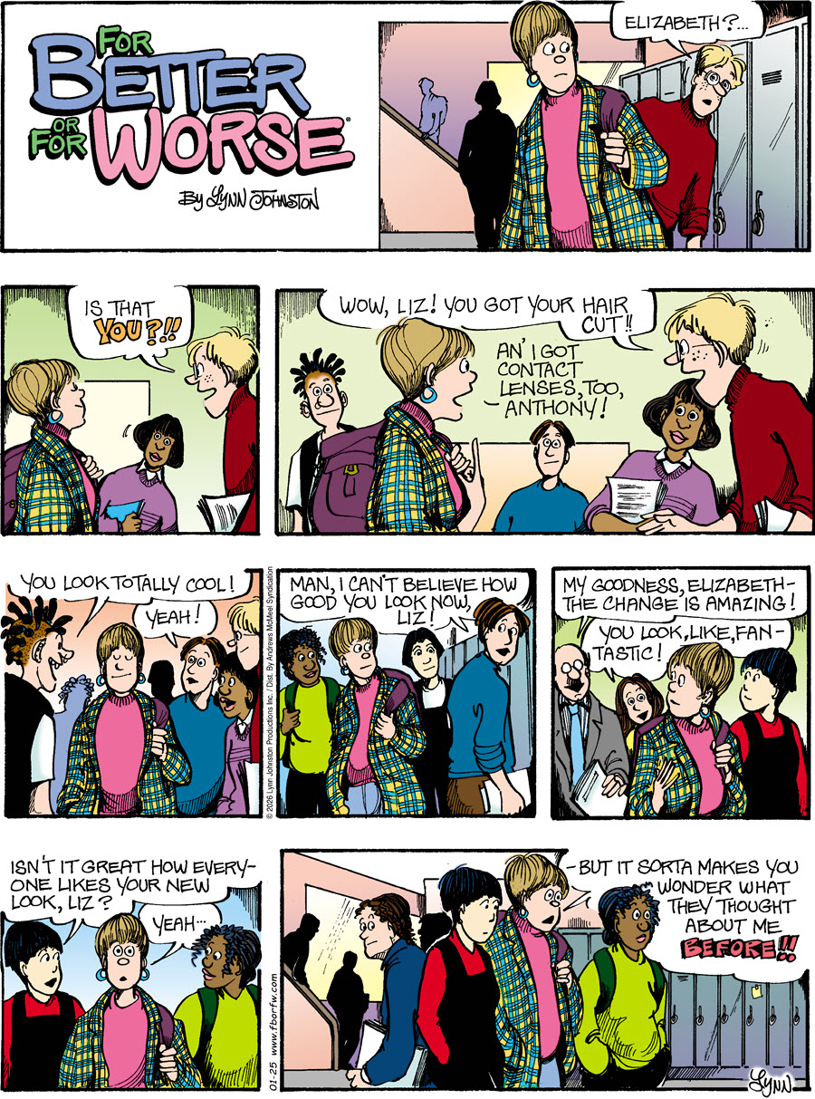 Lynn's Comments: Changing a character’s hair was always a big deal. I figured it wouldn’t make sense for teenagers to not go through some experimentation, so both Elizabeth and Michael had some different “looks” throughout the latter part of the strip. Elly and John, however, stayed pretty much the same.