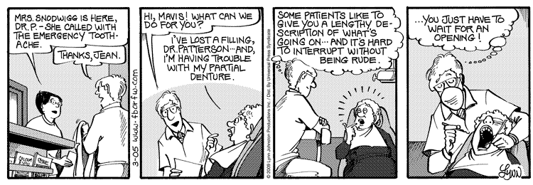Lynn's Comments: I have just returned from a dental appointment. It's fun to see that despite the many clinical innovations, some things never change. My hygienist talked pleasantly about her holidays as she scraped and prodded, trying not to say anything that required an answer...and later Peter, my dentist, did the same. Keeping your mouth open (rather than shut) is easy as long as the topic of conversation is middle of the road...but once a good volley of wit begins, the situation becomes a struggle.