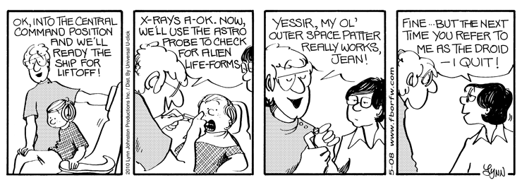 Lynn's Comments: This was an inside joke between Gunther Hildebrandt, a long time family friend, and ourselves. Gunther enjoyed reading the news and discussing current events, especially with my father-in-law. Together, they would solve the problems of the world. Gunther loved to talk, so in this strip I am having a bit of fun at his expense. The dental clinic was never the place to have a really good conversation, especially for the patient.