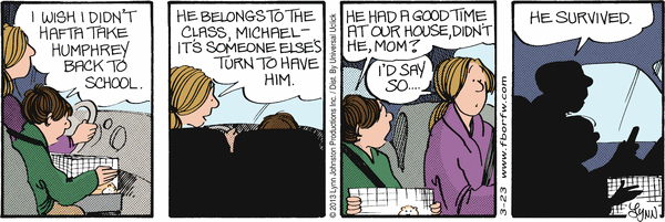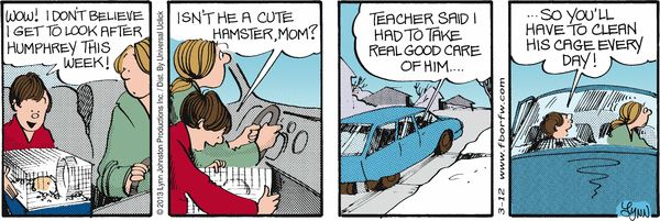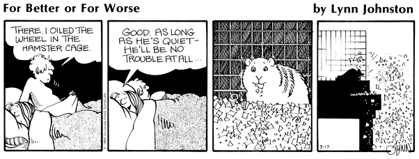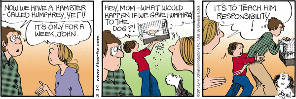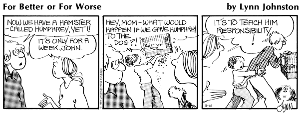 Lynn's Comments: Naming a pet or a person in a comic strip requires about the same amount of thought as naming something or someone for real. I tried to imagine what I would call a hamster--and a name beginning with "H" seemed like a good idea. "Humphrey" appealed to me both because it's not a name commonly heard, and because I liked the "Humph" sound at the beginning.... it's sort of a British "snort," an expression of contempt or dissatisfaction. You never actually hear a "humph," it is most commonly seen in print. I think in the US one might say, "harrumph!"--but this has a slightly different connotation. Ahhhh... the semantics of sound.