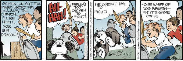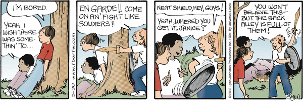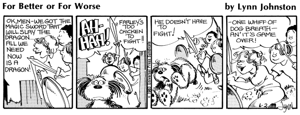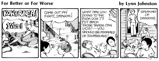 Lynn's Comments: For the new release of this strip, the dialogue was changed to read, "Hey, guys, what's short and round--" I knew I would still get negative mail but perhaps fewer complaints than when it was first printed. People don't want to see derogatory remarks of any kind, even if it's exactly what two little boys would say. I could have deleted the strip, but I rather liked the gag!