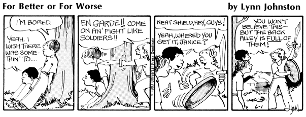 Lynn's Comments: Janice was going to be a regular character in FBorFW. I was looking forward to having a rough and tumble girl down the block who would be an even match for the boys. She was named for a tough kid I knew growing up, and I hoped to explore some of my more daring exploits through her. I imagined Mike and Lawrence battling Janice and other "enemies" in an ongoing quest for neighbourhood supremacy. Sadly, Janice soon disappeared. Perhaps she came on too strong. Perhaps I bowed to reader criticism. Either way, I lost a neat character and some potentially good story lines.