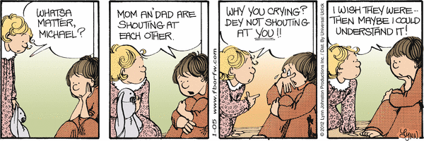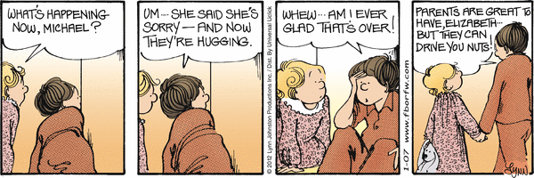 Lynn's Comments: Here's another example of how to bring readers up to date with a few underlying story arcs. In the first panel, you catch up with what's going on in two relationships and still get a kid-fuelled smart remark as a punch line. I loved this ploy!