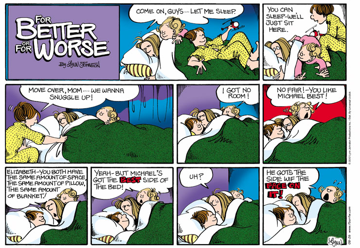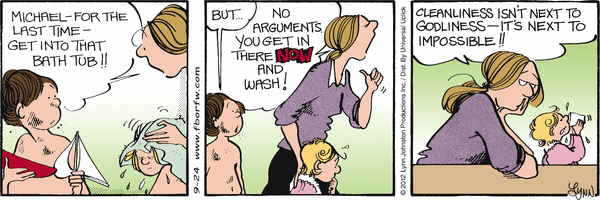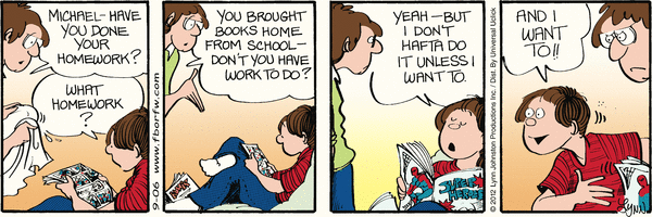Lynn's Comments: What I wanted to say here, was--Michael had a kind heart. He wanted to cheer up an elderly neighbour, but was embarrassed by his own actions and played down the gift by saying the flowers were something his mother wanted to get rid of. I don't think the punch line worked too well and this strip sort of missed the mark. Sometimes the hardest thing about describing a situation like this is...well, describing a situation like this!!