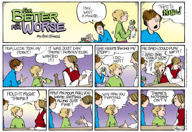 Lynn's Comments: I was so happy while drawing this. A good gag gave me great expressions to work with as I built up to the punch line. Not only did I enjoy the process here, but I was getting back at my mother and all the teachers who told me to "get down to business and hit the books." This strip was a cleansing experience.
