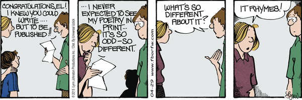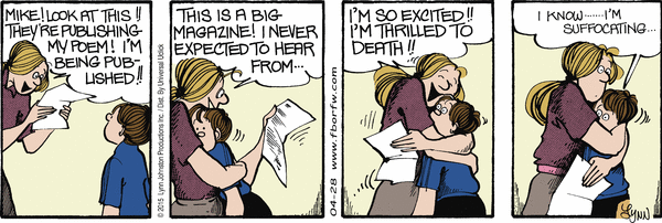 Lynn's Comments: I was equally pleased to have my single panel cartoons accepted by our small local newspaper, "The Dundas Valley Journal." I was in my late 20s, a single mom, and at the time, working at a job I didn't enjoy. Seeing my cartoons published in a real paper with a real audience validated what I was doing and told me there was hope. I could see the possibility of making a living doing what I did best! In the FBorFW comic strips you see here, I substituted writing for drawing, but Elly is me--overwhelmed to see an open door in front of her--just waiting for her to go through.