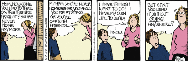 Lynn's Comments: There's no punch line here. There should have been. Mike had an opportunity to answer the question with a smart comeback. I couldn't think of one--so, neither could he. This is when telling on-going stories, making one day's strip lead into another, saved my behind. Now and then I could end a strip with an obvious silence--and get away with it.