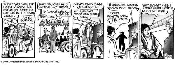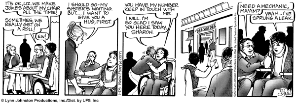 Lynn's Comments: This comment was from an encounter I had with one of the people I met at "Wheelchair Rugby." I learned that it's rude for an able-bodied person to lean or sit on a wheelchair while talking to the occupant because the chair is effectively part of the user's body. I also learned that sitting down to talk to someone who is in a chair is a sign of respect and consideration. These are things I should have known instinctively, but did not. This was a wonderful education!