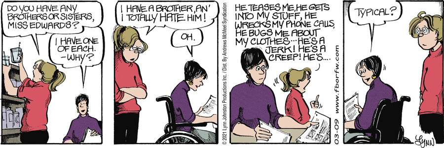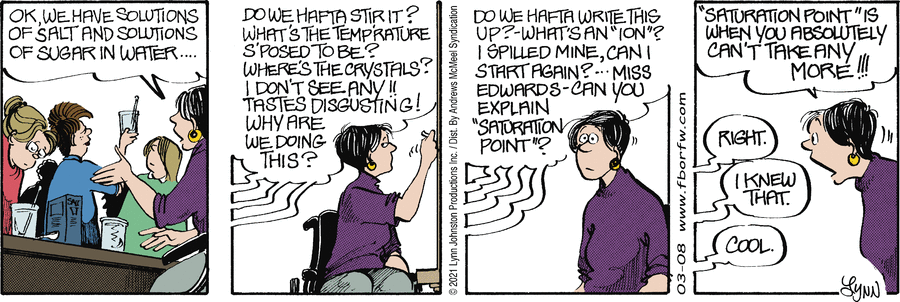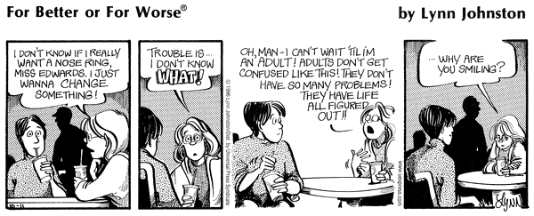Lynn's Comments: Around this time, the newspapers began to colourize the daily strips and often without consulting the cartoonists' own colour charts. This meant mismatched hair colours and different clothing in different papers. One newspaper colourist made the Miss Edwards character Black, which made a change back to caucasian rather difficult. Readers in that area appreciated seeing a Black teacher in the mix. Eventually, correct colour palettes were established, but not before some interesting errors had been made!