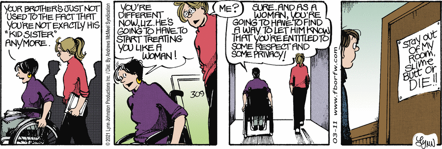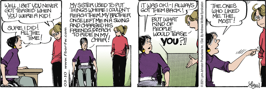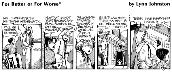 Lynn's Comments: This was a segue into the introduction of the teacher in a wheelchair. I had wanted to show someone in a chair for a while, but didn’t know how or when to do it. Strange, since we all know someone who is disabled. Miss Edwards became a favourite character, but again, I had little space in which to feature one of Elizabeth's teachers.