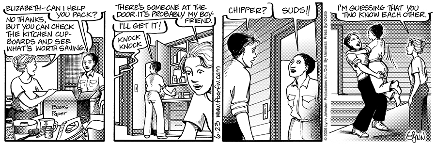 Lynn's Comments: I had fun drawing this character. I had meant her to be very sexy and very nice--someone who would possibly come between Elly and John. She would make Elly jealous, in any case. As the library job continued, Susan became less and less visible. I couldn't quite resolve her relationship to the rest of the characters...and, perhaps, I was afraid that life might imitate art!