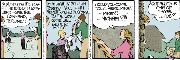 Lynn's Comments: This was one of the exercises we were given to teach Farley to come when called. My husband and I did this endlessly, but to no avail. The trainers blamed us for Farley's lack of success. They said we were not being consistent and should try harder. We did. We believed that with enough repetition, with enough rewards, Farley would learn. He didn't.