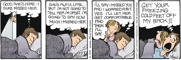 Lynn's Comments: Before the onset of menopause, my feet were always cold. I wore long cotton nightgowns and slept with my socks on (still do!) I don't think I pulled this trick too many times, but the idea was funny and the drawing was fun! Any opportunity to show a character hollering with a mouth wide open like this made my day!