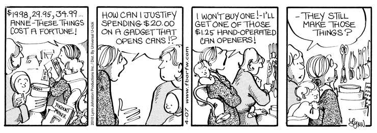 This is the long way of telling you that what Elizabeth is doing in this Sunday strip never happened but it should have. Watching Katie open and pour a can of apple juice, I thought: If she'd made multiple openings, the scene might just have gone just like this.