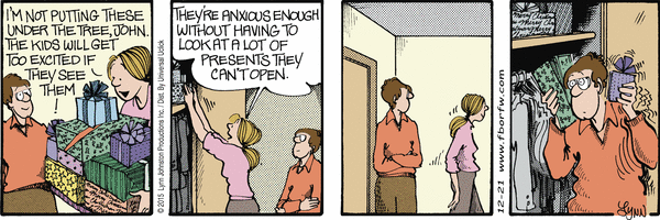 Lynn's Comments: In Lynn Lake, we had Christmas morning to ourselves and after lunch we'd walk over to Ruth and Tom's house for more openings and Christmas dinner. My in-laws always gave us practical gifts, so this strip was just for fun. Nobody gave the kids horns and drums - they were noisy enough as it was. Sitting in their living room surrounded by family and food, paper and presents is an image I'll keep with me forever. What you see in this strip is all of us the way we were at a time when life was perhaps more complicated, but far less stressful. Memories and magic is what Christmas is all about.