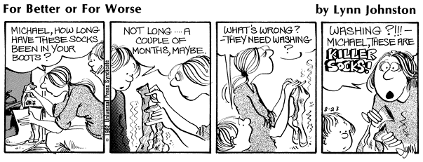 Lynn's Comments: For some reason, stinking socks are funny... much like burps and toots. In truth, the fact that kid's footwear did give off noxious gasses surprised me. But, then again, kids and odors go together like dogs and fleas. My son could wear a pair of socks until they were stiff and no amount of washing could restore the colour, no matter what it was. I dragged dirty socks into the text several times and each time readers reacted with comments like; "Whoa! this happens at your house, too?"!