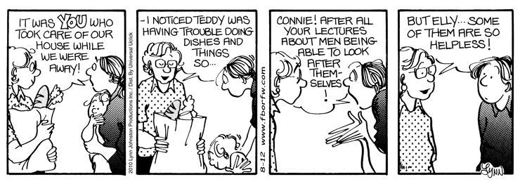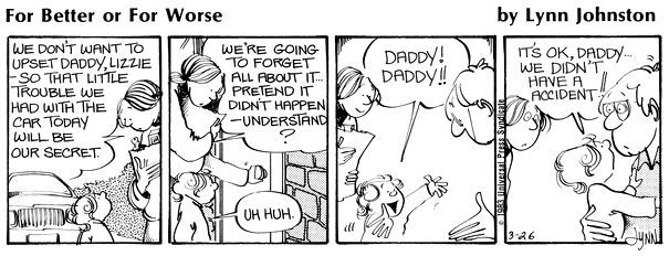 It was hard not to perpetuate the errors. Talking baby talk to our offspring was not our style, and yet we loved the sounds and the new words they invented as they learned how to communicate. It was interesting to see how a newfound ability with language made for nonstop talking. You can't wait for them to be able to tell you what they're thinking ... and, later - you're wishing they'd be QUIET!!! The dialogue in this strip went exactly as written, except that I kept the punch line to myself!