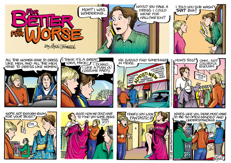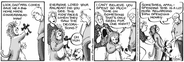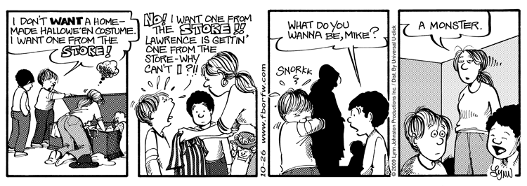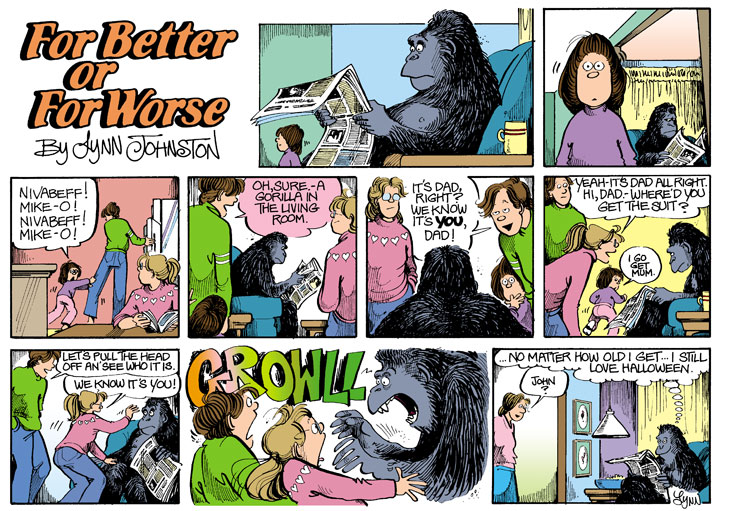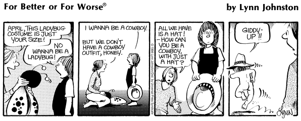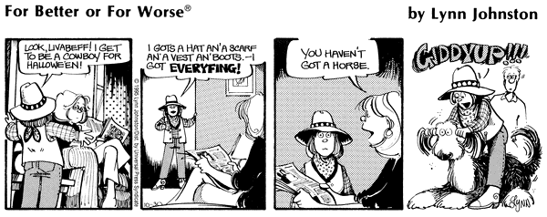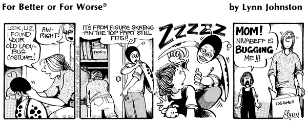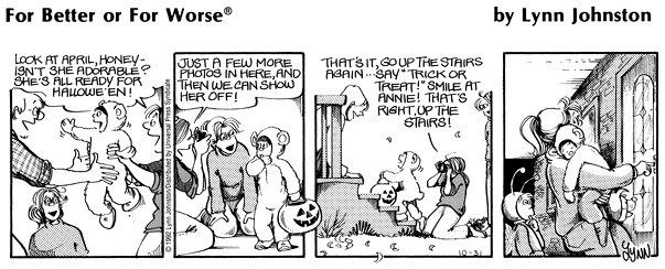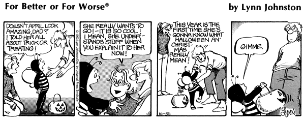 Lynn's Comments: The town of Lynn Lake was small enough that kids could be out on their own and you knew they wouldn't be much more than a block away. Even so, one of us always accompanied the trick or treaters - as much for the social interaction as for their safety. Aaron resented having Kate along - he didn't like to be slowed down. So this didn't happen. This was another "what if" moment. What if Lizzie's appearance resulted in more loot?