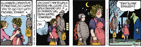 Lynn's Comments: Mike Peters (Mother Goose and Grimm) tells a story about how upset his girls would get if he embarrassed them in public. Now, Mike just can't help himself--he's a wonderfully theatrical guy with a prankster's edge. When one of his girls left her school lunch at home, he delivered it in person by leaping into her classroom dressed as Superman. This strip reminds me of that day, and how Marci still winces when she thinks of her dad in that costume.