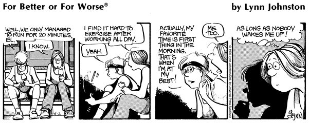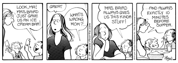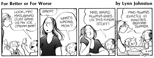 Lynn's Comments: Puns were a favourite punch line. They were untranslatable, however, which made it difficult for my syndicate to sell my work to non-English-speaking countries. I knew that word play limited my sales, but if I could come up with a good pun, I figured it was worth the loss.