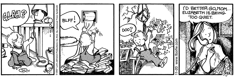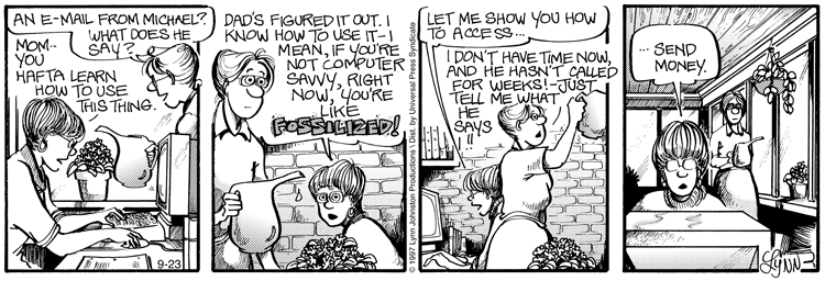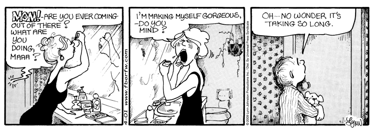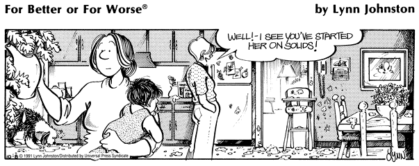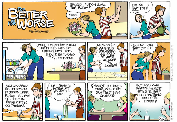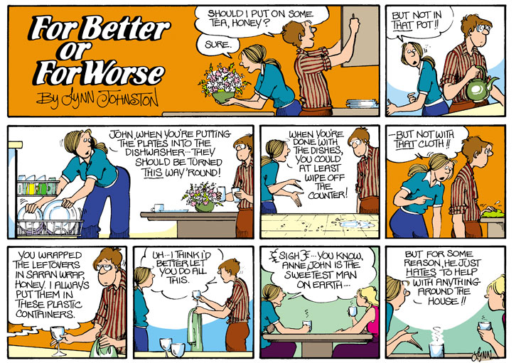 Lynn's Comments: Some Sunday strips were so true, they were painful. This was me. This was my husband. He did try to help, but I actually prevented him from doing so. In drawing this strip, I hoped other wives would see themselves. I think some did!