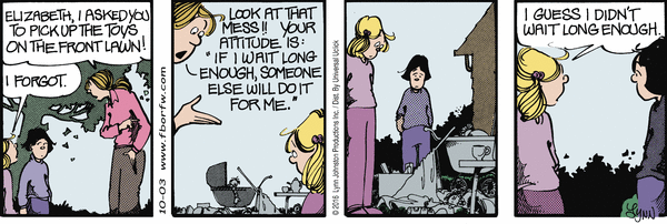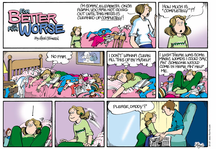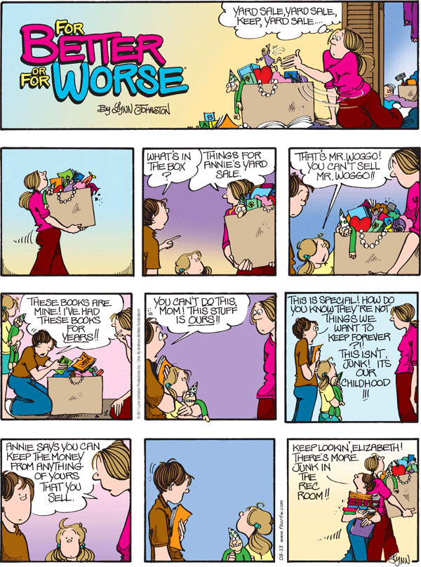 Lynn's Comments: Again, a Sunday strip that didn't have to be invented. Word for word, this was real dialogue, and I wrote it down on a paper towel in the kitchen. I never seemed to have a notebook available. There was one in my bedside table for ideas that came in the night, but during the day, I had to grab whatever scrap of paper I could find. I learned quickly to capture an idea as soon as I could. My chequebook, which was always in my purse (before credit cards), was filled with punch lines, fast sketches, and ideas for future strips. Trying to remember these things later was impossible, and if I let a good one get away, I'd be miserable! This exchange made for a cathartic cartoon and saved my son, once again, from the wrath of Mom.