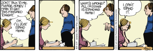 Lynn's Comments: This is another true situation. There were times when I was so engrossed in writing or drawing the strip that I was oblivious to everything else around me. My kids could talk to me, ask for things, say stuff that didn't make sense, and I'd simply nod and smile. An entire day could go by and I'd forget to eat or even get up and walk around. It was like being in a sound sleep. There were times when people would have to distract me from my work, look me in the eye, make sure I was absolutely focused on them, and then say what they wanted me to hear!