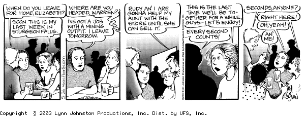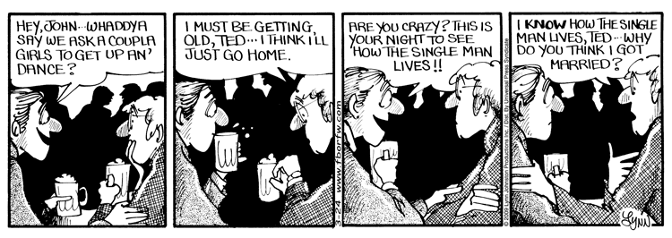 Lynn's Comments: Again, there was no "Ted" in our community. This character was entirely fiction. Here, John has beer with his colleague in an upscale shop on the street below their clinics. In the strip, the world is fictional. John and Ted are working in a cosmopolitan environment with 4-6 storey buildings around them and a large parking lot on the corner. In reality, our clinic was above Perepeluk's Grocery and the only coffee shop you might go to schmooze in was "Wong's Cafe" across the street. The old wooden booths and the coffee counter with the worn round stools welcomed you like a 50s movie set. The smell of egg rolls, wonton and fried rice filled the down in your parka and would linger there for hours, "poofing" out whiffs of Wong's.