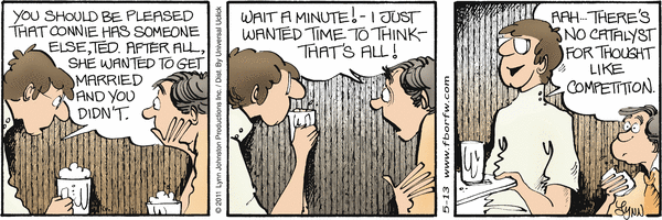 Lynn's Comments: This idea came from a lunch I had with Peanuts creator, Charles Schulz. We were in a busy pub. There was a hockey game on the big screen television, and when someone shot the winning goal, the bar erupted in, “We’re number one! We’re number one!” Sparky turned to me and said, rather dryly, “I don’t understand. How can these people say they’re number one when all they did was sit here? They did nothing!”