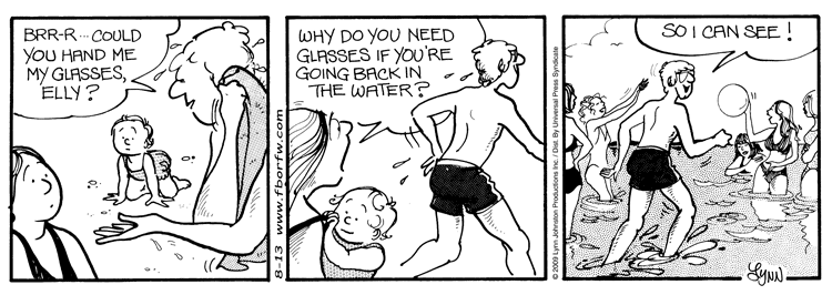 Lynn's Comments: Here is another strip that got me into hot water. Removing Michael's towel while he was changing was a reportable offense! The problem with a static image is the subtle elements, which would otherwise explain things, are not there. You can't show subtle things like eye movement, shrugs, knowing smiles, and reassuring gestures. The artist knows the situation is all in fun, but the audience does not. What should be funny is therefore sometimes misinterpreted.
