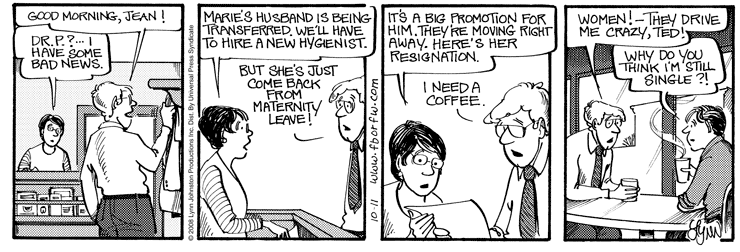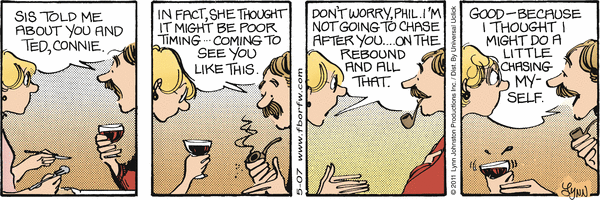 Lynn's Comments: When I was a single mom, I dated a man who sent my head spinning, then stopped the carousel, saying that because I was not of the same religion, I was not "forever". His family would never accept me and he was moving on. He was a serial "shiksa" man and I was number 61! In my machinations afterwards, I fantasized his return; his begging for forgiveness and his asking for another chance (fodder for a good song). This never happened to me...but in the strip, it happens to Connie. She readily accepts Phil's apology and for awhile their relationship goes on.