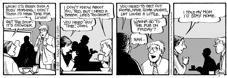 Lynn's Comments: Looking back at these strips, I can see exactly when they were done by the kinds of things I slotted into the background. In this scene, John and Ted are having a chat over lunch, and rather than draw two talking heads, I put them in a bar. In an effort to be up to date, I showed them playing one of the latest table-top video games. Strange... I recently found one of these covered in dust in an "antique" shop!