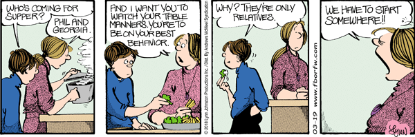 Lynn's Comments: My mom was a stickler when it came to good manners. "Please," "thank you" and "pardon me" were drilled into us. We had eating lessons. She made us sit with a Golden Book under each arm so we could learn to eat without raising our elbows. There was a litany of rules: "Chew with your mouth shut! Don't pick your teeth in public! Don't blow your nose on the napkins! When you're finished, put your knife and fork together (like a clock’s hands) at seven thirty five!" Use of the knife and fork was carefully monitored. If we slouched at the table, mom would put a yardstick down our backs. This was strict and somewhat crazy, but my brother and I learned how to eat with good manners and it’s been a valuable skill, which has lasted us all our lives!