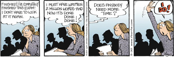 Lynn's Comments: When I did this strip I hadn't written an exam in years, but the memory of the challenge, the anxiety, and the thrill of getting it over with will never be forgotten. Having finished a difficult exam I would panic and wish I could go over it just once more. Turns out that your first answer is almost always the right one and there's danger in having time to "fix" what you thought was an error!