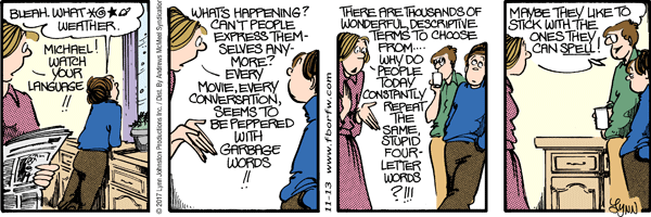 Monday November 13, 2017 Lynn's Comments: This strip was done when certain 4 letter words were rarely used and never in mixed company. Now, they are commonplace. How sad. There was a time when we were proud of our language, and now we are working hard to protect it.