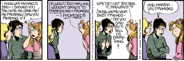 Monday November 27, 2017 Lynn's Comments: Interesting to see the word "like" becoming an essential and repetitive part of a kids’ vernacular. This strip was done in the 80s! I had no idea "like" had been so annoying for so long.