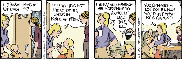 Lynn's Comments: There were times when well meaning friends, knowing I was at home, would drop in during the day. I would come up from the studio, long enough to be polite--sometimes I'd put on the coffee, but I was on a deadline and every minute spent away from the drafting table was time I'd have to make up later on. One woman was very unhappy when I told her I had to work. Having two kids of her own, she looked at me angrily and snapped "So do I!" When I look back at all the comics I did while juggling family, food, chores, business trips, volunteer stuff and just plain living, I wonder how I managed to do it all.