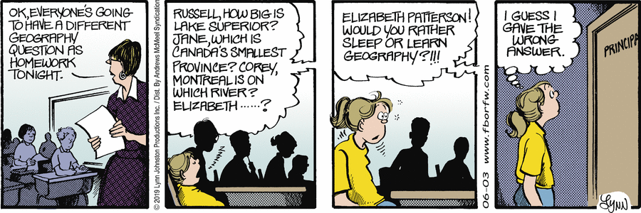 Lynn's Comments: I loved referring to Canadian history, customs, places and geography. Before I signed my contract with Universal Press, one of the editors insisted I refer only to the United States—that the strip had to be about Americans. I asked him if he, born and raised in Kansas, could write knowledgeably and realistically about a family in New York. He admitted he could not. I said, if I couldn’t have my characters live in Canada and write what I knew, then I wouldn’t sign the contract.