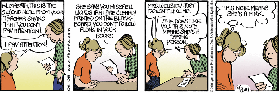 Lynn's Comments: The truth is, it was my son who needed the glasses. This scenario was happening, but I shielded him by making Elizabeth the one who was having trouble in school. Things like this were often hard on my kids as they tried to explain to their friends what their mom was doing and that their lives did not run parallel to the characters in the strip.