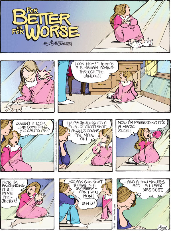 Sunday March 17, 2019 Lynn's Comments: This was a strip that warmed a lot of hearts, and was one that I was particularly proud of. If it weren’t for particles in the air, sunbeams wouldn’t show up. This is one of the rare instances when one can appreciate dust!