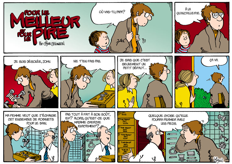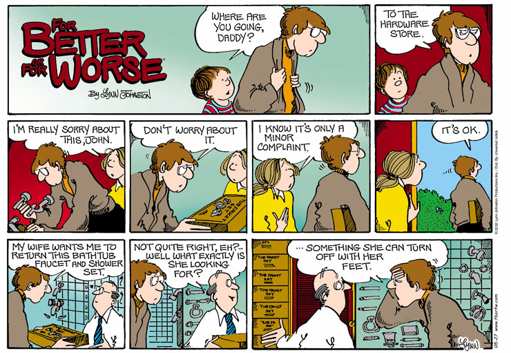 Lynn's Comments: When this strip was released, I received a number of letters from women, mostly, saying that they too wanted bathtub faucets you could turn off with your feet. Whenever I travelled, people would comment on strips like this one and they would immediately start to tell me some intimate truth, some personal thing you would never tell a stranger! I heard about people's sleep habits, their food preferences, their parenting tips, their illnesses. They told me other things, too; about their fears and failures, their marriages, divorces, and family backgrounds. It was as if I had become a familiar friend who would always listen, be supportive, caring, and discreet. This kind of trust is something I will always cherish--it's the best part of having done a family's story with a bitter-sweet style.