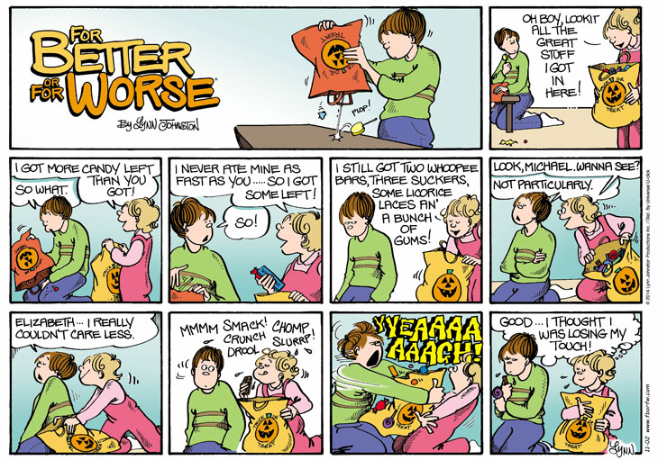 Lynn's Comments: After Halloween, Katie would save up her goodies until Aaron went dry. Unlike her older sibling, she could restrain herself from eating all of her stash at once--which surprised me. Of the two children, she had the sweetest tooth. We even called her "Cake" instead of "Kate" because she liked desserts so much. At the end of October, however, willpower set in. She could hoard her gains in full view, then savour each morsel after Aaron's was long gone. I remember watching him as he pretended not to be fazed by the sounds of crinkling wrappers followed by lip smacking and the sound of "mmmmmm." I was surprised that he didn't pounce on her or ask me for a treat to make up for the discrepancy. He just put up with the injustice, and I wondered when and how he'd get even, because this would come about, guaranteed. Like my brother and me, my kids were creative teases!