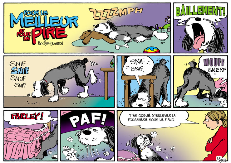 Lynn's Comments: Farley...the REAL Farley was both the source of dirt and the mop which picked it up. He would go about the house sniffing and rooting for crumbs and other household flotsam, his fuzzy face pressed to the floor. When he raised his head, his chin would be flattened and full of dust. A lot of the dust was his. He was so hairy that even with regular vacuuming, a slight breeze would cause a wave of grey to float across the kitchen. It was unending. Still, despite the responsibility and the extra work, he was loved and he was part of the family....and in retrospect, he was probably much, MUCH cleaner than the kids!