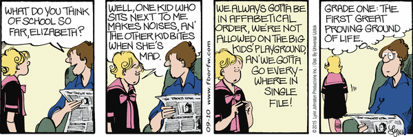 Lynn's Comments: In grade one, it's cool to be at the front of the line. This coveted spot was fought over. Kids nudged and jostled each other until one held the spot--undisputed. I wanted to be first in line so badly I couldn't stand it. One day, I made it to about sixth, and just as we all stopped shoving, the first kid in line brought up his lunch. The next kid turned green and went to the back of the line and so did the next. This went on until I was first in line. I couldn't believe my luck! I didn't care about the barf, in fact, I leaned over and shouted to everyone, "Guess what! It was macaroni and cheese!" At this, two other kids threw up. "Weaklings," I said to myself as the doors opened. The line began to flow around the offensive patch and into the building with me in the lead. From then on, I claimed first place whenever I wanted it. I'd earned the right.