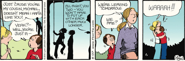 Lynn's Comments: In the real world, Aaron and Katie got along well with their Manitoba cousins. At the time this work was done, there were two Cruikshank girls, Lauren and Chrissie; Arli came along later. I wish I could have shown everyone, but there was no time or space for more characters. As it was, I had more people in the strip than I could comfortably write about!