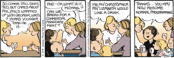 Lynn's Comments: Here's another example of how to bring readers up to date with a few underlying story arcs. In the first panel, you catch up with what's going on in two relationships and still get a kid-fuelled smart remark as a punch line. I loved this ploy!